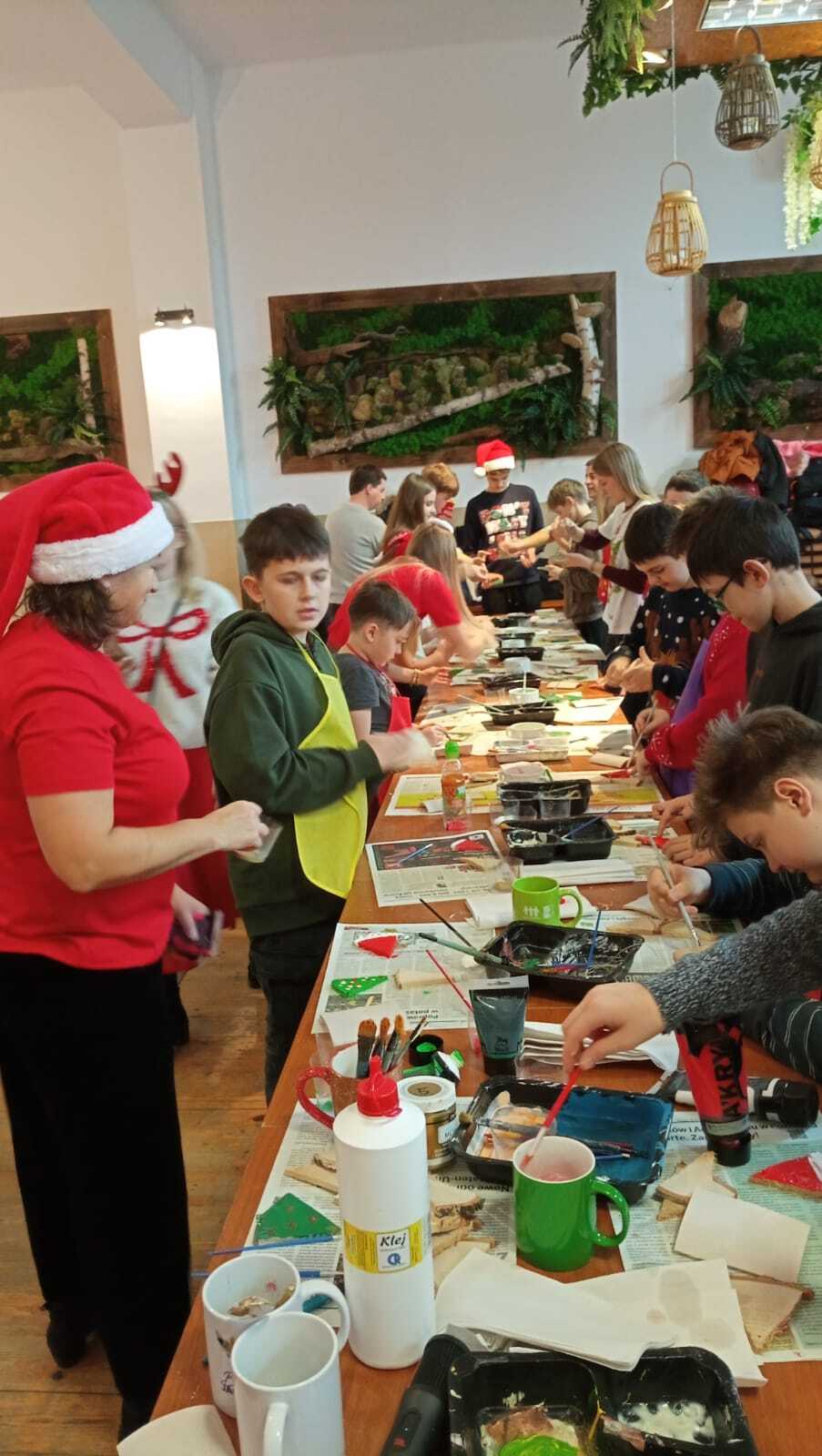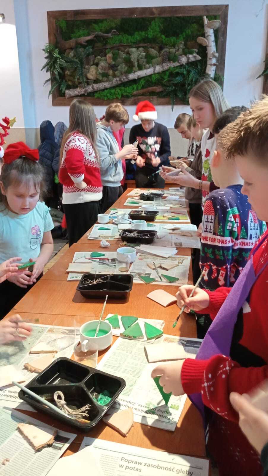 Jednym z elementów mikołajkowego spotkania były warsztaty kreatywne. Młodsze dzieci z ogromnym zaangażowaniem dekorowały świąteczne pierniki, korzystając z kolorowych lukrów, posypek i czekoladowych dodatków. Starsi uczniowie natomiast zajęli się tworzeniem drewnianych choinek - pracochłonnym, ale bardzo efektownym zadaniem, które pozwoliło im wykazać się cierpliwością i artystycznym talentem. Powstałe ozdoby niewątpliwie staną się wyjątkową pamiątką tegorocznych Mikołajek.